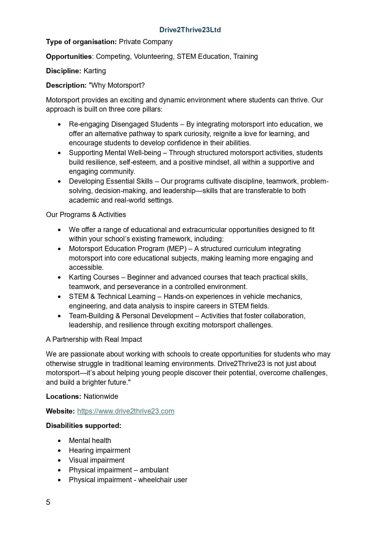 With the permission of the organisations, this directory features a number of organisations that support a range of disabilities within motorsport. These organisations play a vital role in making motorsport more inclusive and accessible by providing resources, advocacy, and opportunities for disabled individuals.