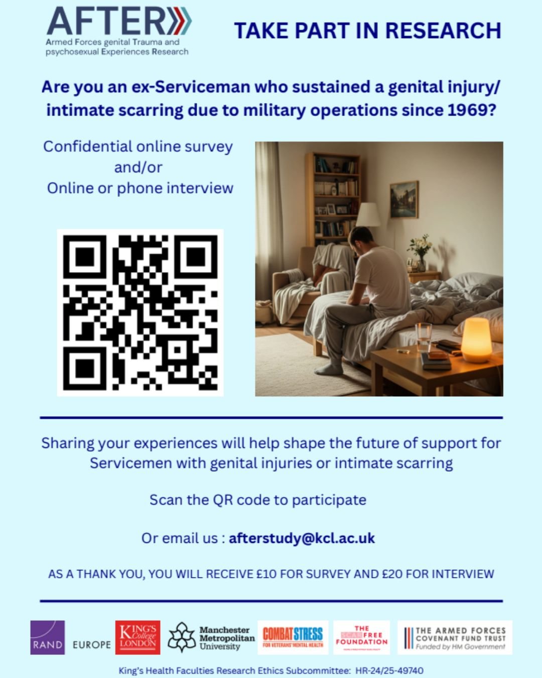 The After Study: The UK’s first large-scale study into the psychological, social and sexual impact of conflict-related genital injuries to help understand long-term impacts; develop practical, evidence based support and identify and address critical gaps in current care provision. Funded by a transformational grant from Armed Forces Covenant Fund Trust, researchers from RAND Europe, The Manchester Metropolitan University and King's Centre for Military Health Research (KCMHR), in collaboration with Combat Stress, will work with Veterans, their intimate partners, and experts to create practical support resources.