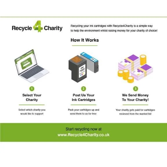 Recycling your ink cartridges with Recycle4Charity is a simple way to help the environment whilst raising money for your charity of choice.